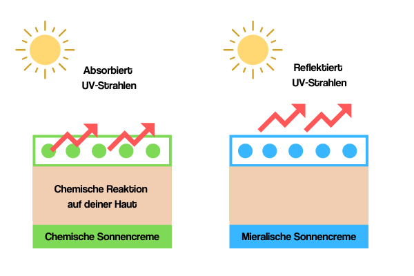 Mineralische Sonnencreme (die Zinkoxid oder Titandioxid enthalten) liegen dagegen wie ein Schutzfilm auf deiner Haut und reflektieren die UV-Strahlen wie ein Spiegel.
